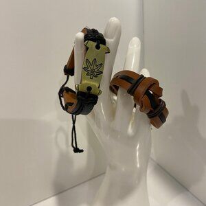 Pot Leaf Weed Leather 2 Bracelet duo Set With Metal Plate & Adjustable Strap