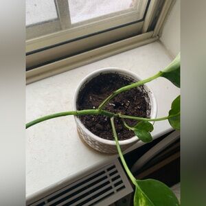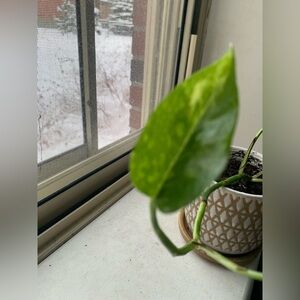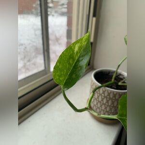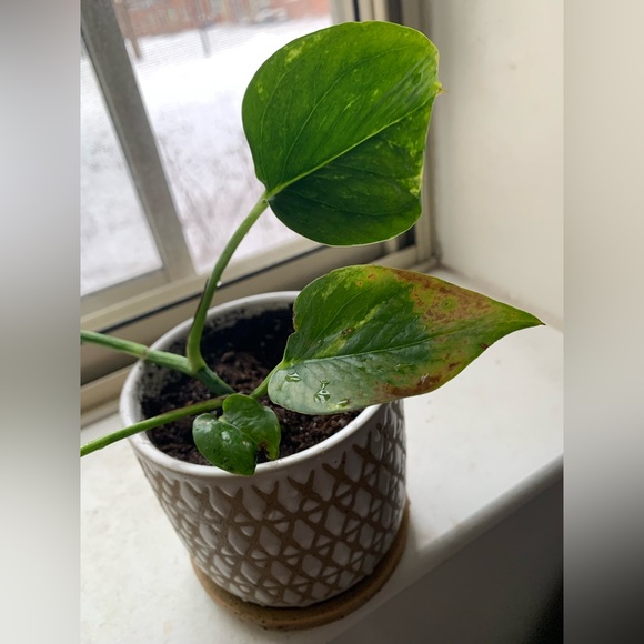 This pothos plant is still on the watch for mealy bugs, hence it’s in my other room isolated from other plants. It’s doing better for sure as it’s putting out new leaves and growing as usual but I would still keep an eye out just in case. Simple and easy to care for, water once or twice a week as it dries out. Check the soil with your finger just to be sure and keep it in bright light. Style With books or travel picture frames:)