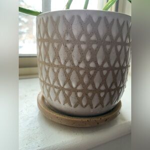 It’s potted in a ceramic planter that has a built in saucer and a drainage hole. It would benefit from some fertilizer or new top soil in a few months.