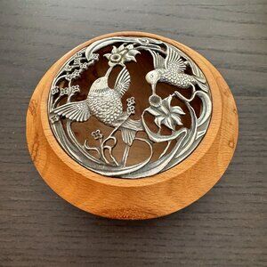 Potpourri Bowl Vessel Turned Beech Wood Handmade Pewter Hummingbirds Top Cover