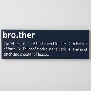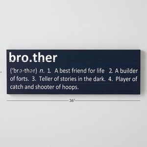 Pottery Barn Kids Brother Sibling Plague. A sibling is one of the greatest gifts in the life of a child. Help your child celebrate the joys of having a brother or sister with our rustic wood plague.