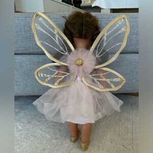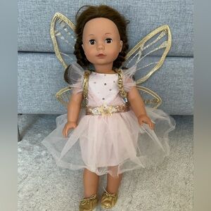 Played with and in fair condition- the hair always goes first! Please see photos. Eyes are functioning perfectly as are limbs and skin is pretty clean, some faint tiny marks. Is currently dressed in the fairy outfit which was purchased separately. Comes with original dress and jean jacket. We’ve lost the boots!