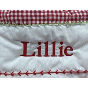 Pottery Barn Kids Lillie Peanuts Snoopy with Christmas Tree Quilted Holiday Stocking. Monogrammed "Lillie." Stock number 834841. Measures approximately 20” x 11.” Condition is new-other. Note: faint stain on the snow area below Snoopy- see last picture.
