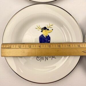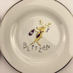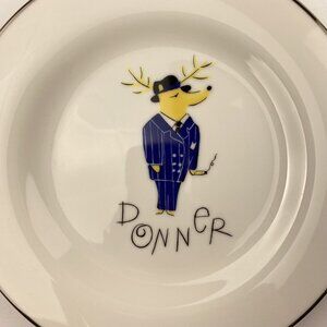 This is a set of four Pottery Barn Reindeer 8.5 inch side plates, featuring Comet, Cupid, Donner and Blitzen. Made in Japan. Very cute graphics. There is no box.