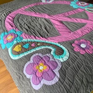 Mini corduroy fabric with peace sign and flower appliqués.