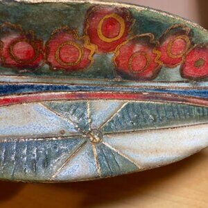 Beautiful handcrafted leaf-shaped pottery dish, perfect as a trinket holder or catch-all. Features rich red, green, and blue tones with elegant gold highlights. A lovely accent piece for any space — great for jewelry, keys, or decorative display.