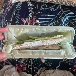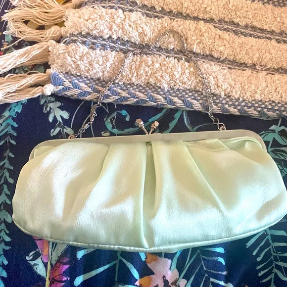 Small evening light mint green silk pouch. Never used. No tags. Comes with 2 handles. One mark.