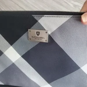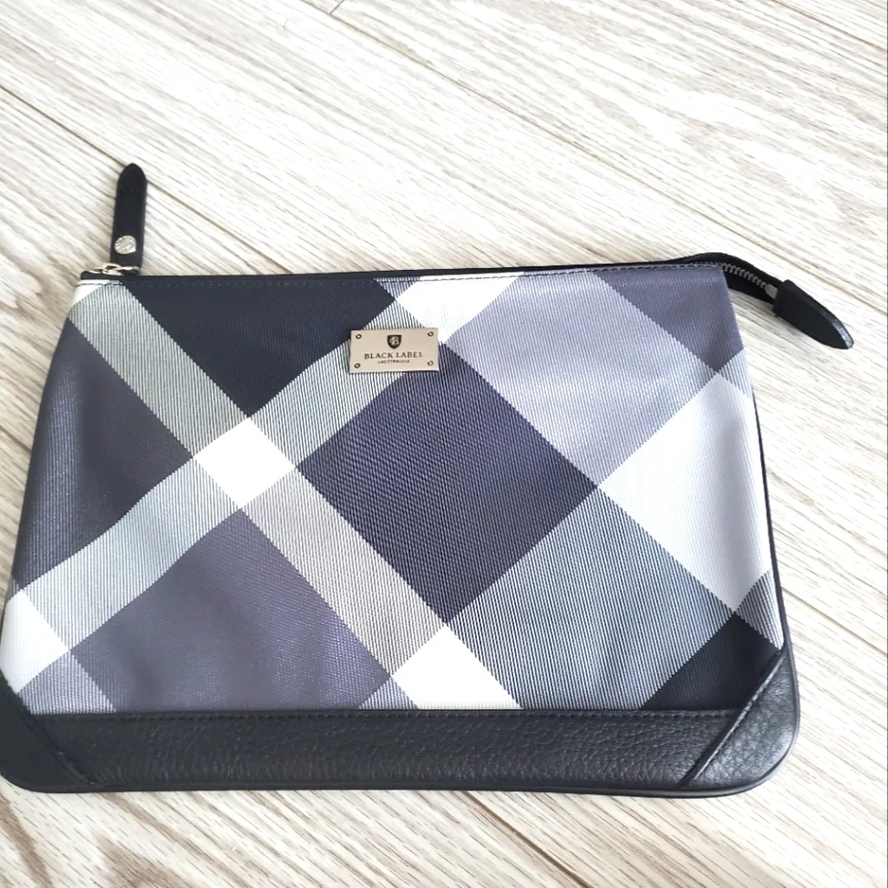 Black check design, fabric with leather trim. 28.5cm x 20cm (very handy & right size to fit iPad mini) Made in japan