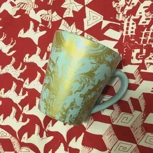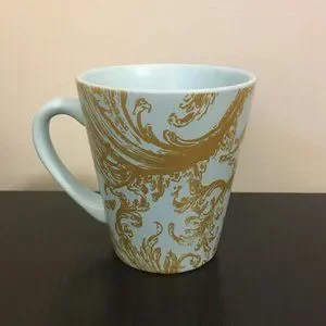Good preowned condition robin egg blue mug with golden rococo damask pattern. I honestly have no idea where this came from. There's no brand or signature either. Simple, graphic and fun. Bundle for less.
