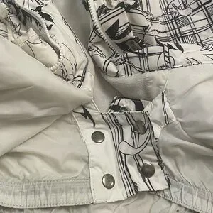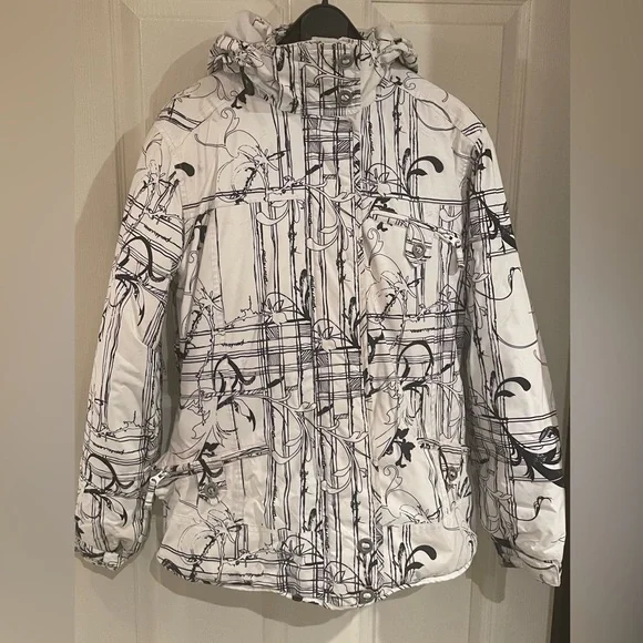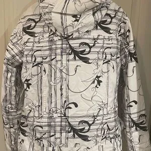 Stylish Powder Room Core jacket in sleek black and white yPerfect for outdoor adventures. Well loved will have imperfections satisfactory -good condition multiple pockets zipper enclosures with Velcro has one interior pocket draw strings ,has interior snap on enclosure towards bottom of jacket as an extra wind/cold protection as well hoodie is not detachable. It’s machine washable I have an repair patch refer to photo