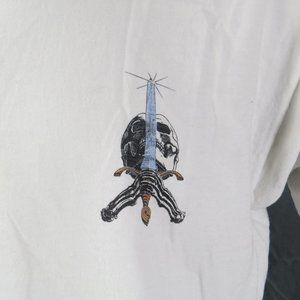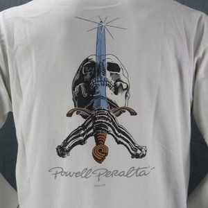 Up for sale is a Powell Peralta shirt. It has a white base colour with the skull and sword graphic screened on the right side of the front of the shirt. The back of the shirt has a large version of the skull and sword graphic screened on. What a great shirt do not miss out on it.