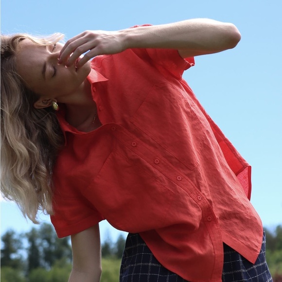 Women's short sleeve, loose fitting shirt with large chest pockets.