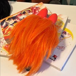 Cute doll with vibrant orange hair and a red bow. Features large expressive eyes and a playful design.