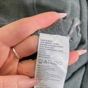 Soft, easy care lightweight sweater with assymetrical hem and rear peplum. Fiber tag is missing, but information gathered online confirms it is 100% organic cotton. Machine wash and dry.