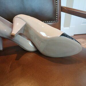 Beautiful patent leather pumps, new and unworn. 2 1/2" heel .Padded footbed for comfort. Peep open toe.In black and taupe. Man made outer sole. Handmade in Europe.