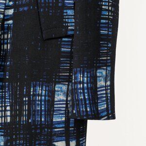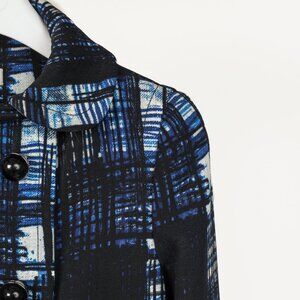 This coat from Prada's 2010 Autumn and Winter collection is crafted with a thick wool crepe in a blue and black abstract print, and features long sleeves, padded shoulders, a rounded collar, a double-breasted button front with a snap closure, front welt pockets, and is lined in a solid black satin.