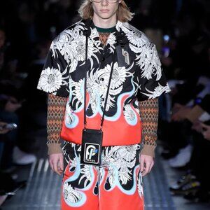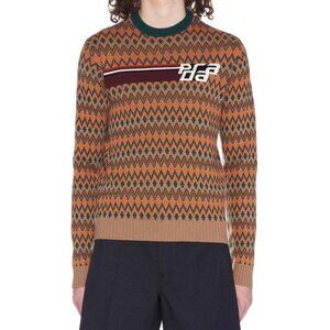 Tailored in Italy, this sweater from Prada’s 2018 Autumn and Winter runway collection is expertly constructed with a Camel Brown cashmere and wool blend knit in a chevron pattern of green and orange hues. It features long sleeves, ribbed cuffs, a ribbed crew neck, a ribbed banded hem; and is finished with a striped intarsia logo on the chest in red, burgundy, black, and white hues.
