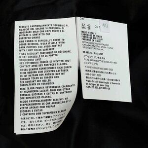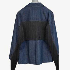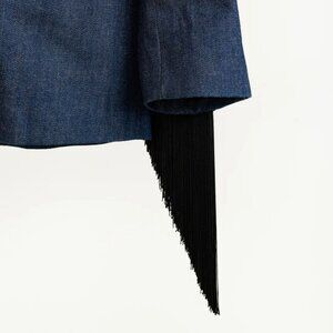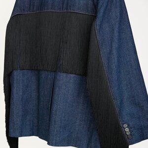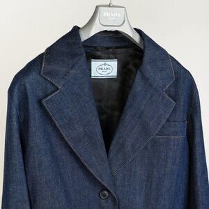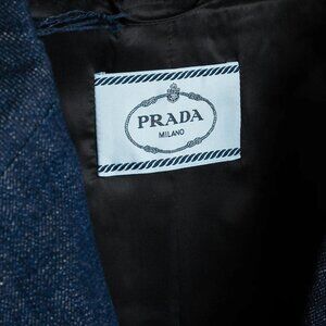Expertly crafted by Prada, this raw denim fringe blazer offers a unique blend of style and sophistication. Made with high-quality raw denim, it features a luxurious fringe detail that adds a touch of playfulness to the classic blazer silhouette. Perfect for any occasion, this blazer is a must-have for any fashion-forward individual.