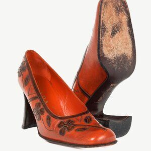 Made in Italy, these pumps from Prada's 1996 Autumn and Winter collection are crafted with a distressed orange leather, and are adorned with floral appliques all over. They feature stacked mid-heels, closed square toes, and leather lining and soles.