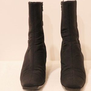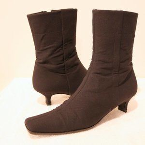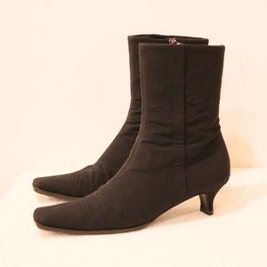 A minimalist design Prada square pointed toe booties black, lightweight featuring zip entry at inner sides.