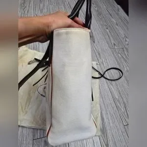 Prada Overture bag features a canvas body with leather trim, rolled leather handles, detachable flat leather shoulder strap, top zip closure and interior zip pocket.