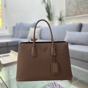 This is an authentic PRADA Saffiano Cuir Medium Double Bag in Cammeo colour.