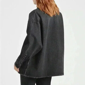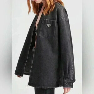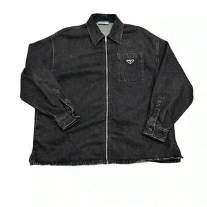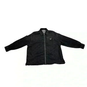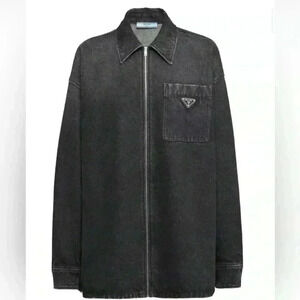 Prada logo-patch denim shirt jacket from PRADA featuring black, cotton, enamel triangle logo, spread collar, front zip fastening, chest patch pocket, drop shoulder, long sleeves and straight hem