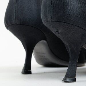 An absolute icon, these embellished Prada pumps recall the 1990s. Combining a feminine pointy shape with a distinctive "comma" kitten heel, these pumps in black textile are well-loved, but still showstoppers. Made in Italy, of course.
