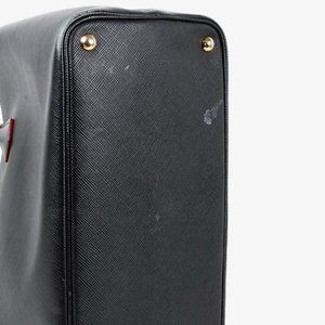 Crafted from Saffiano leather in black with shiny gold-tone hardware, the medium Prada Double tote flaunts a contemporary silhouette with an open top, the iconic Prada triangle logo at the front, a pair of rolled leather handles with leather luggage tag, and protective base studs. Its segmented interior is lined in luxurious Nappa leather in red and equipped with a central flap pocket. With snap closures on the sides, this chic and modern tote can be expanded as needed and carried by its handles or on the shoulder with its detachable leather strap.