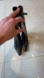Prada black leather knee-high boots with mesh details on side and kitten heel.