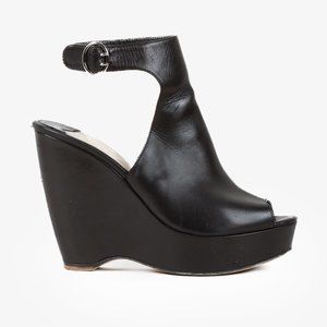 Black sandals from Prada crafted out of soft leather featuring a peep-toe, an ankle buckle, and a platform wedge.