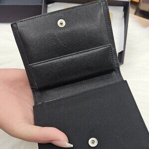 The flap opens to reveal a tri-fold interior crafted from matching leather, featuring two card slots, patch pockets and a currency flap pocket .