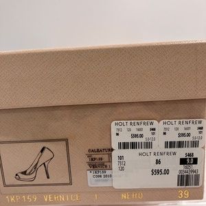 Includes box and shoe bag. Replacement heel tips provided also by Prada
