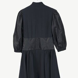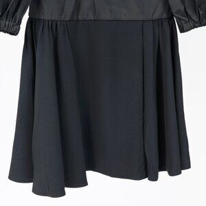 Made in Italy, this dress from Prada circa 2021 is crafted in a mix of black crepe and Re-Nylon, and features puff 3/4 sleeves, elasticized cuffs, a mock neck, a half zip closure, a banded waistband with a zip pocket and the designer's iconic triangular logo, and a gathered mini-length skirt.
