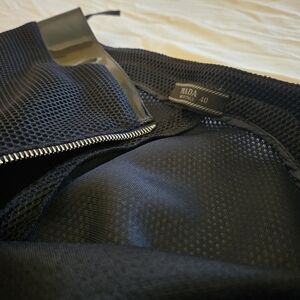 Elevated and timeless, these Prada pants are crafted in Italy with a unique black textured mesh fabric and sleek patent leather waistband trim. Designed with a mid-rise fit and straight-leg silhouette, they feature a polished front zip closure with Prada-branded hardware. A sophisticated wardrobe essential that pairs effortlessly with heels, boots, or sneakers.