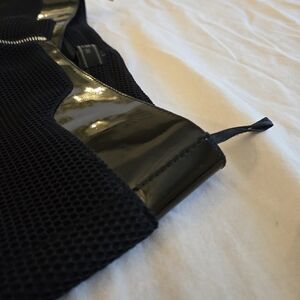 Material: Polyester/viscose blend with patent leather accents (based on texture)