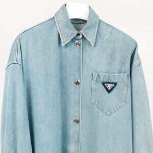 Made in Italy, this vintage-inspired shirt from Prada circa 2021 is crafted with an organic cotton denim in a Bleu wash, and features long sleeves, buttoned cuffs, drop shoulders, a shirt collar, front button and snap closures, an oversized fit, a left chest patch pocket with the designer's signature enameled metal triangle logo, contrasting stitching, and distressing and fading throughout.