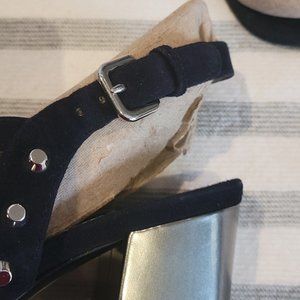 Prada, EUC, Size 10, Navy Suede Studded Sandals with muted silver block heels, matching the studded details. Eye catching sandal!! Other than some wear on the sole, these sandals are in excellent used condition.Dust bag as shown, also included.
