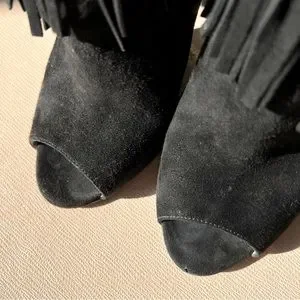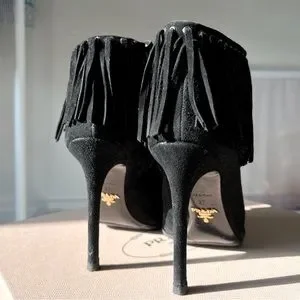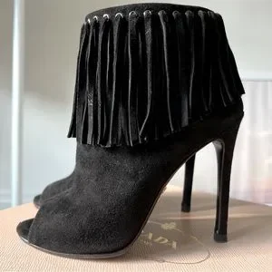 Prada Camoscio booties in black suede. These boots have a beautiful fringe detail and miniature silver grommets at the ankle with zip closure on the insides. In excellent used condition. Only worn a handful of times. Minimal to no wear in footbed and inner liner. Rubber toppy non slip soles and lifts put on at shoe repair ($50) Size 36.5. Comes with original box. Paid $975