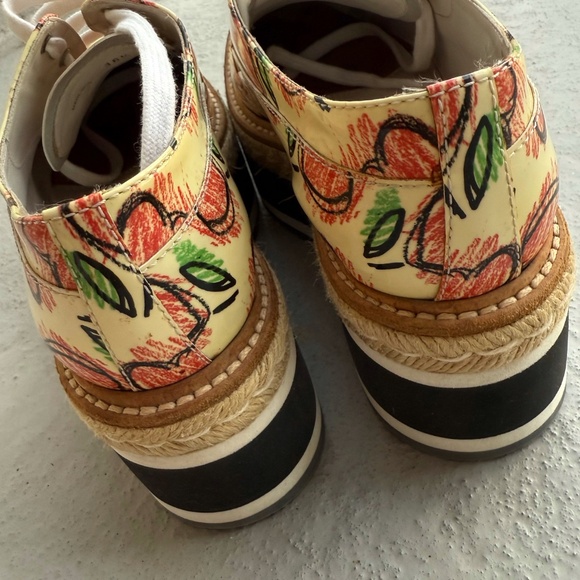 Rare Prada brogue platform derby shoes, crafted in smooth butter yellow leather with whimsical red heart and green leaf hand-drawn motifs. Featuring a bold layered sole with natural jute and rubber base, these shoes combine Prada’s timeless craftsmanship with a playful, collectible twist.
