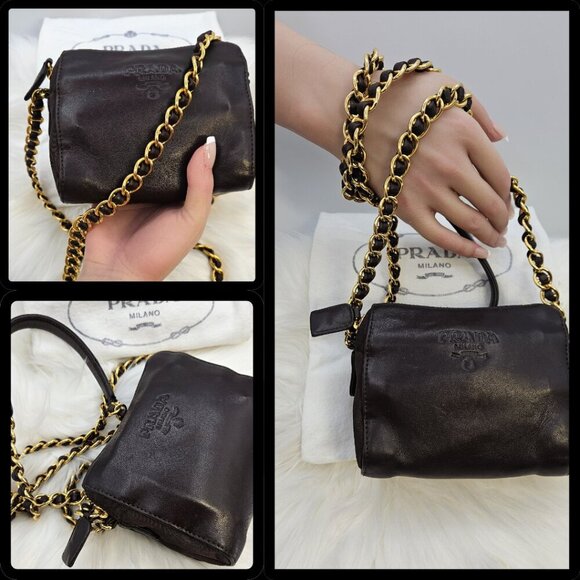 Crafted in Italy with brand code 59, boasts a sleek Nero leather exterior, complemented by gold-tone hardware, nylon trim, and stylish chain-link accents.
