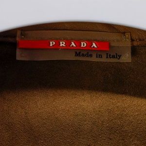 This vintage Prada suede biker jacket features ribbed panels wrapping the underarms, zippers along the sleeves, two breast pockets, two side pockets, a zippered front, and a snap button closure at the neck. The jacket’s interior collar is lined with leather and a leather trim runs down the shoulders.