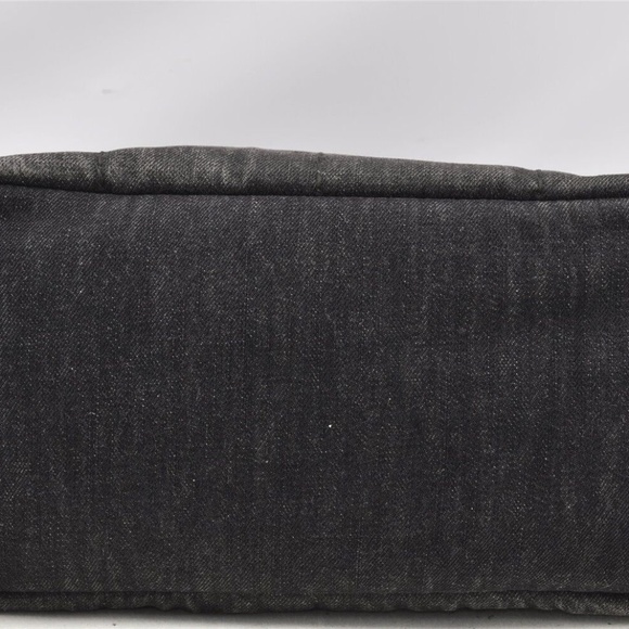 Authentic Prada Canapa bag in grey black cotton denim. Prada logo screen printed on front of bag, logo is still in great condition no fading or damage. Signs of wear on corner of bag, no other rips or wear. Gold tone hardware, all in tact. Interior of bag is composed of the same outer material, no stains or rips. Interior has 3 pockets, one with a zipper closure. Dimensions approximately 12" x 8" x 6", handle drop 5".