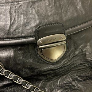 Black Prada soft leather bag with gunmetal chain shoulder straps (BR4820 model). A large roomy purse full of compartments to carry your everyday essentials! The bag has a buckle closure, interior zipper pockets and card accessory pockets on either side. Interior is completely leather lined in a light rose-beige colour. One side of the bag has a Prada hardware logo. The Prada logo is also embossed on the inner side of the opening flap. The back of the bag has a snap closure for additional storage. Black hardware feet on the bottom. Retails for $1,950 CAD+ tax. Made in Italy.