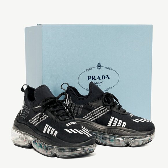 Circa 2019, these low-top Cloudbust sneakers from Prada are crafted in a Nero black Nylon Tech knit with white geometric designs throughout, and feature closed rounded toes, front lace-up fastening, branded detailing on the rubber trim, back pull tabs, clear midsoles, and chunky rubber outsoles.