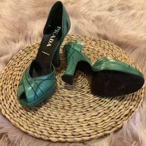 Elegant Prada heels in a rich green shade. Perfect for any occasion.