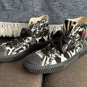 High-top canvas sneakers featuring graphic pattern in black and white throughout. Round rubber cap toe. Lace-up closure in black. Rubberized logo appliqué at outer side. Treaded rubber sole in black. Antiqued silver-tone hardware. Tonal stitching.