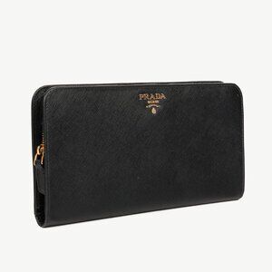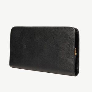 Crafted from luxurious black Saffiano leather with gold-tone hardware, this Prada wallet is both stylish and functional. The snap closure opens to reveal multiple zippered compartments, card slots, and a slip compartment, providing organization for all your essentials. The iconic gold logo at the front adds a touch of sophistication.