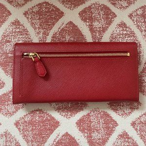 Decorated with Prada lettering, this flap wallet is crafted in Saffiano leather. The double snap closure opens to various compartments, pockets and credit card holder.