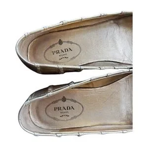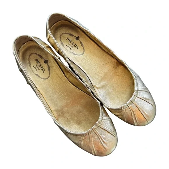 Prada metallic gold ballet flats featuring rounded toe, ruched detail, leather insole, and slip on entry. Made in Italy.